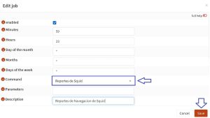 Y configuramos a sarg para que se ejecute todos los dias a las 23:59, antes que squid rote su archivo, ver siguiente imagen.